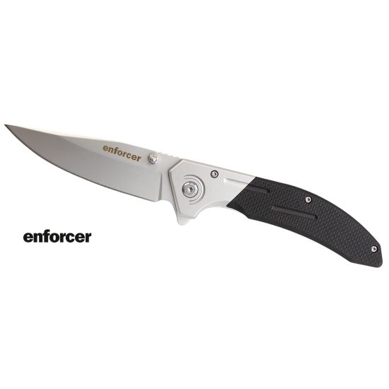 Dieses enforcer Einhandmesser besticht durch sein edles Satin-Finish und den robusten 440er Stahl. Dank des Daumenpins lässt sich die Klinge einhändig leicht in Arbeitsposition bringen, wo sie zuverlässig durch einen Frame-Lock-Mechanismus gesichert wird. Die Vorderseite des Griffs ist aus strukturiertem G10 gefertigt, während die Rückseite aus satiniertem Edelstahl besteht. Zusätzlich ist das Messer mit einem Taschenclip ausgestattet.